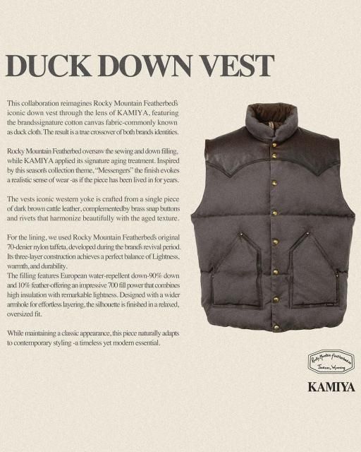 KAMIYA(カミヤ) は 2025 秋冬コレクションのルックでも登場した、アメリカ発のヘリテージブランド Rocky Mountain Featherbed(ロッキーマウンテンフェザーベッド)とコラボレーションしたダウンベストを 10 月 25 日(土)に発売。