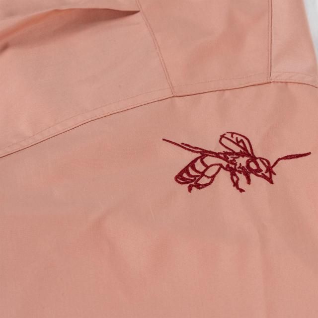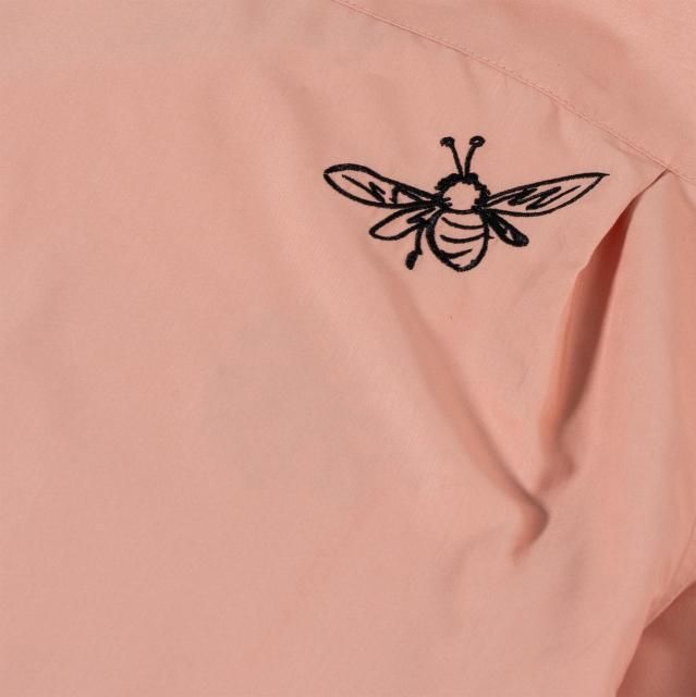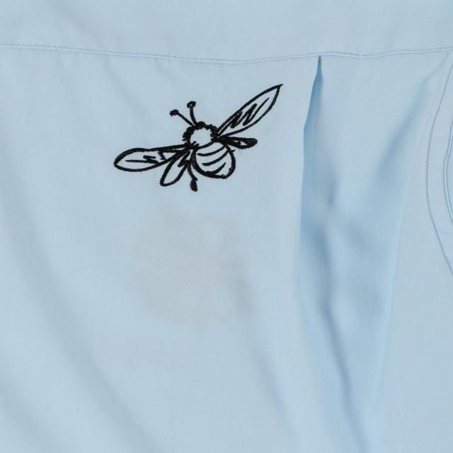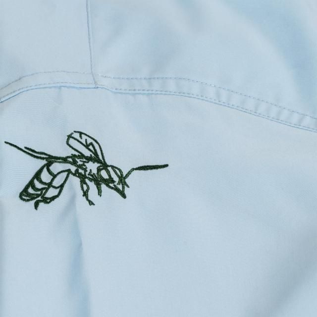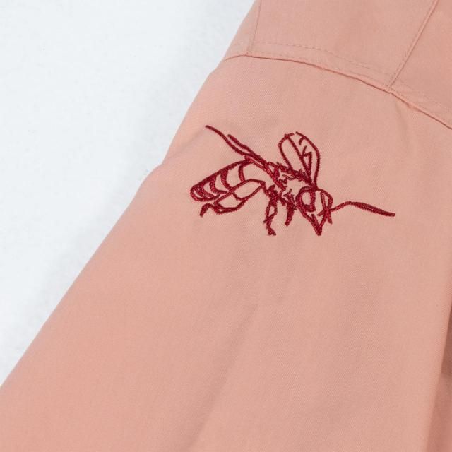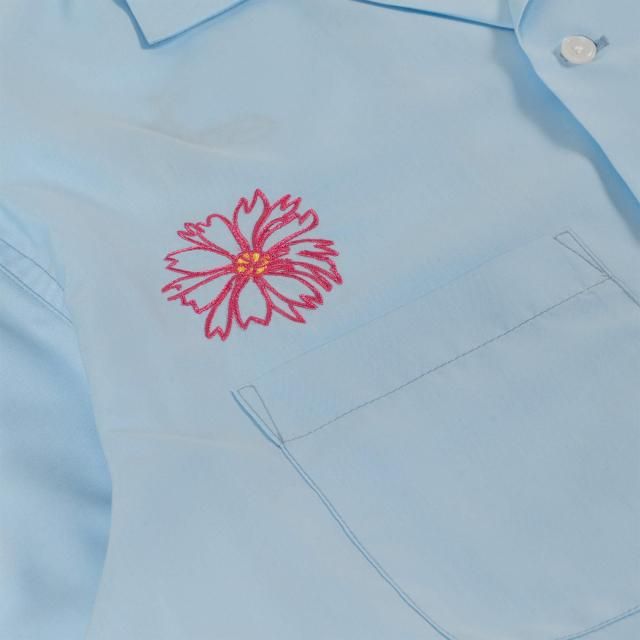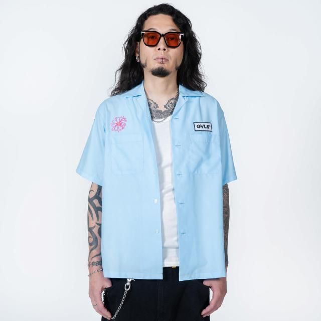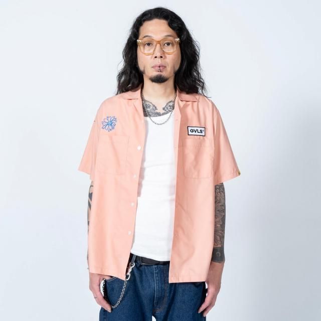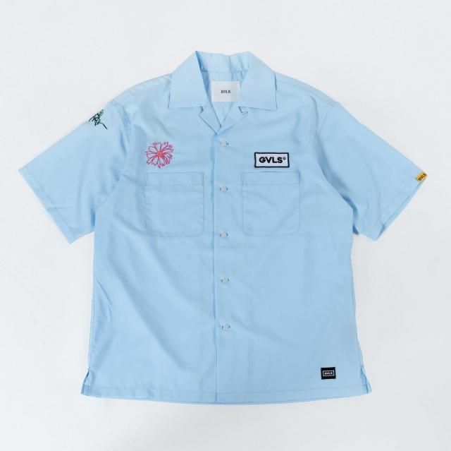 右胸にGVLAのワッペンを配置し、左胸、左袖には手書きの花と鉢の刺繍が。ワークシャツのイメージをそのままに敢えてフリーハンドのデザインのデザインの刺繍がGVLSのユニークさを放つ1枚。